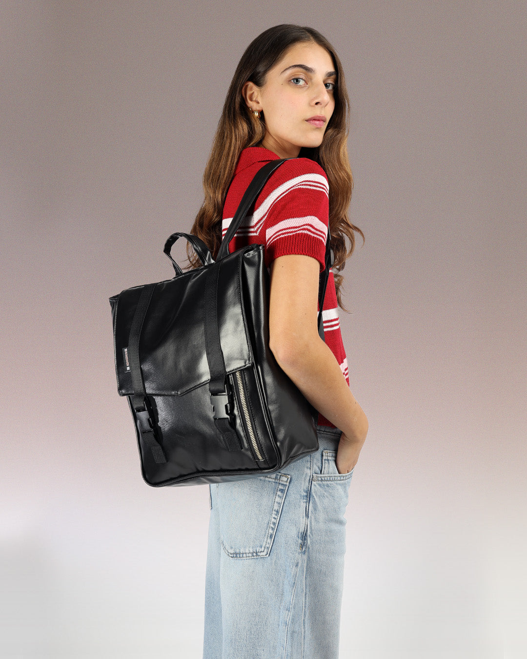 Mini Tokyo closes easily with two flexible clips that stay secure even when the backpack is full.