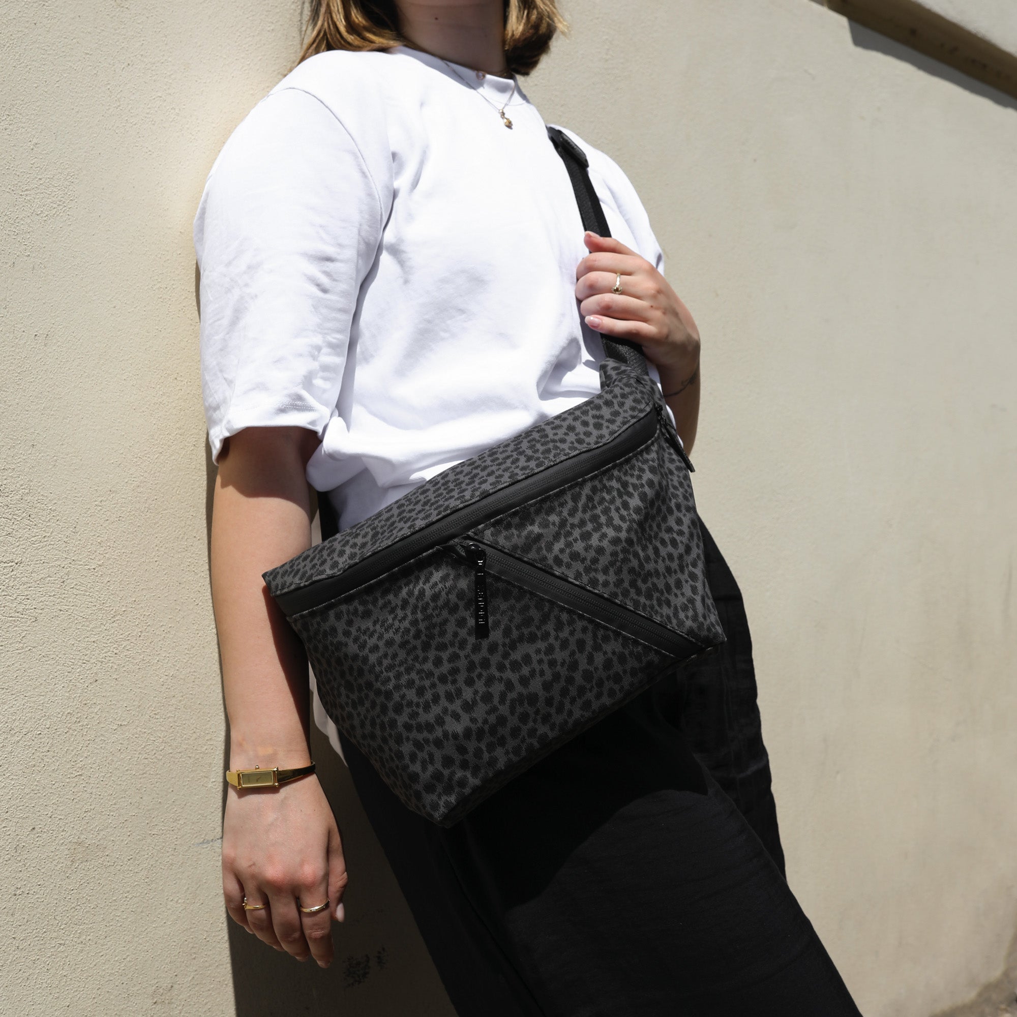 The main compartment of Rover XL is massive and holds far more than you'd expect from a pouch: a large water bottle, book, chargers, wallet, sunglasses, and even an iPad. On the front and back, you'll find two external pockets for quick and secure access to everything you want close to your body.